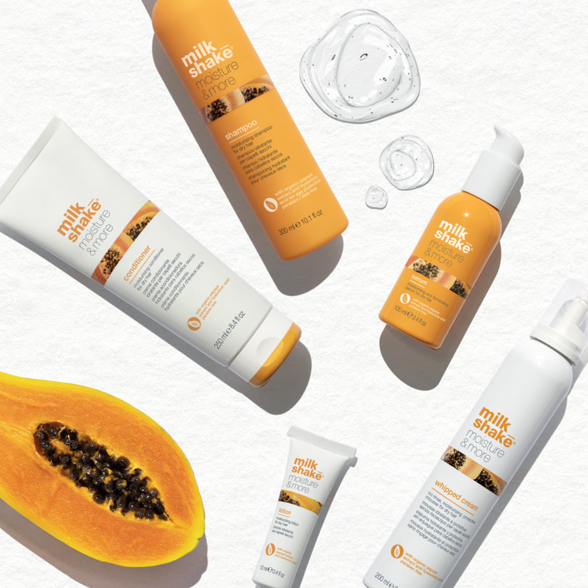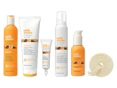 Nourishing products for dry and difficult to comb hair. The combined effect of yaluronic acid, niacinamide and organic papaya extract is a source of deep hydration for the hair, which is visibly plumped up.